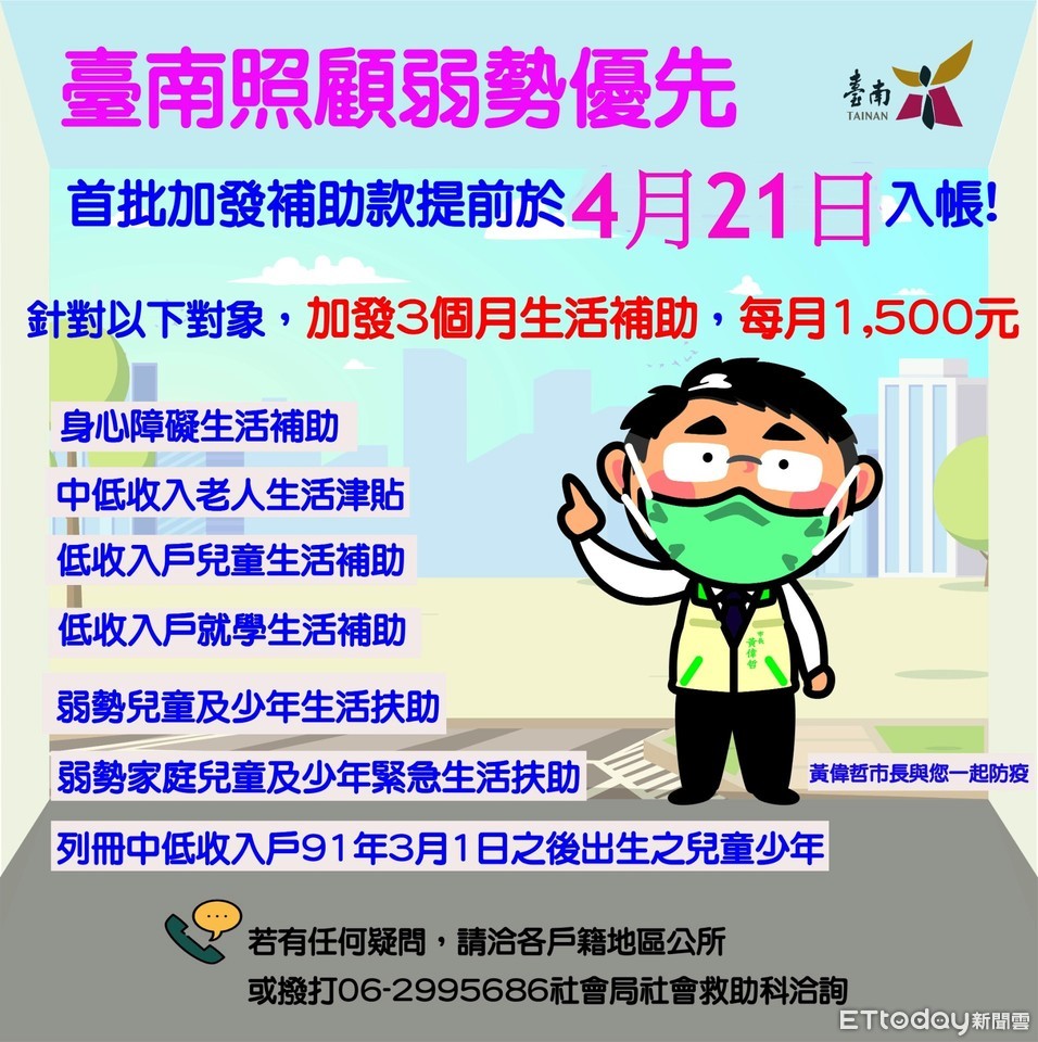 ▲黃偉哲市長認為關懷弱勢刻不容緩,責成社會局立即配合中央政策,超前於21日即可發放首批行政院加發補助款。(圖/記者林悅翻攝,下同)