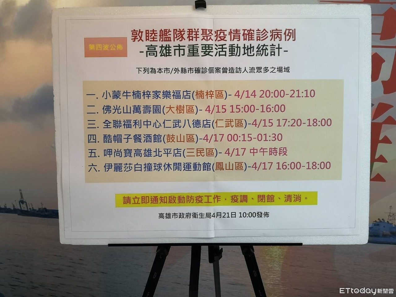 因應新冠肺炎疫情,高雄市政府21日上午召開新冠肺炎記者會,針對近日爆出軍艦群聚事件,高雄市衛生局再公布確診官兵第四波足跡史,其中竟有知名景點佛光山萬壽園,其他還有楠梓家樂福、全聯福利中心仁武八德店、酷帽子餐酒館、甲尚寶高雄北平店以及伊麗莎白撞球休閒運動館。