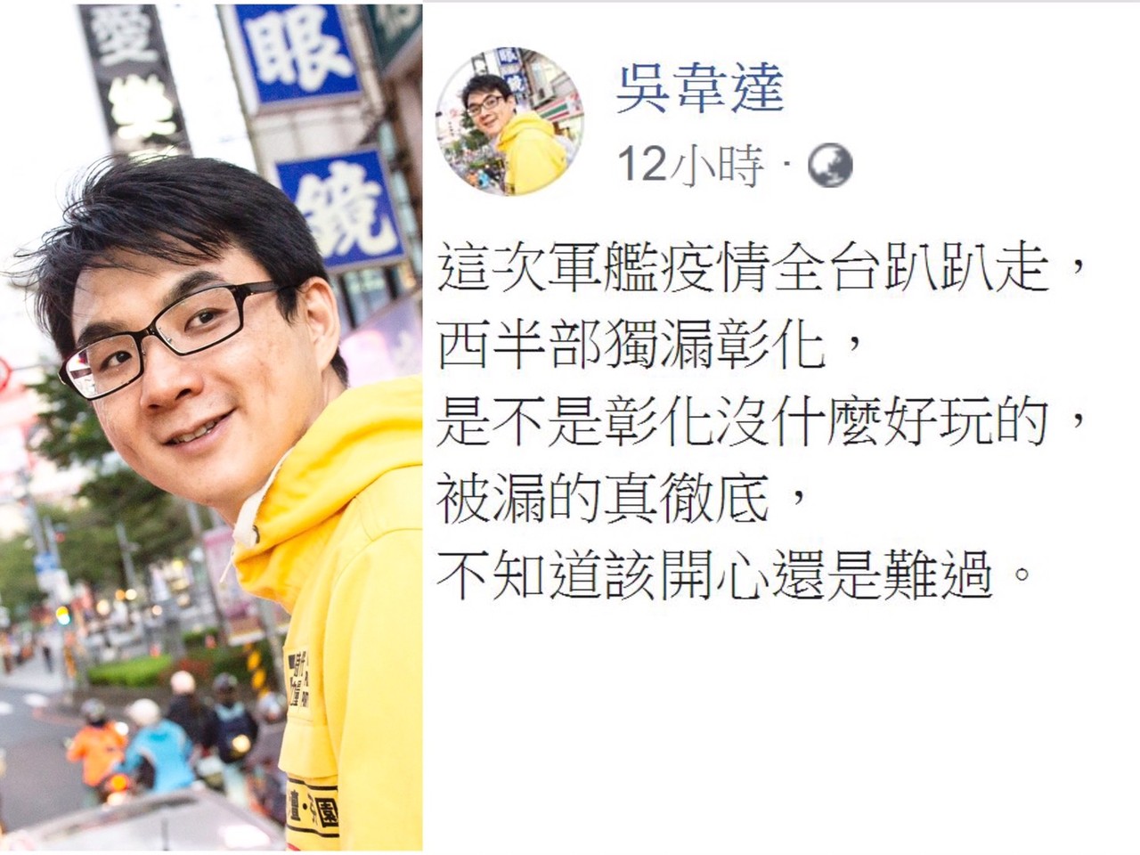 ▲磐石軍艦總計24例確診,各地縣府紛紛公布多個地點,西半部唯獨彰化被漏掉,對此時代力量議員吳韋達開玩笑自嘲邊緣。(圖/翻攝吳韋達臉書)