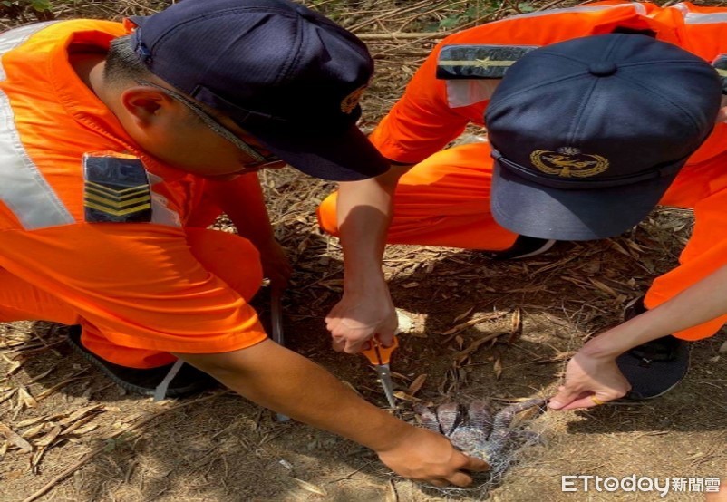 南部分署第六岸巡隊山海安檢所人員於4月21日下午1時許,在廳舍大門外草叢發現1隻椰子蟹遭漁網纏繞受困,立即協助脫困,經墾丁國家公園保育員確認為保育類椰子蟹,因無外傷且生命跡象良好逕行實施野放。
