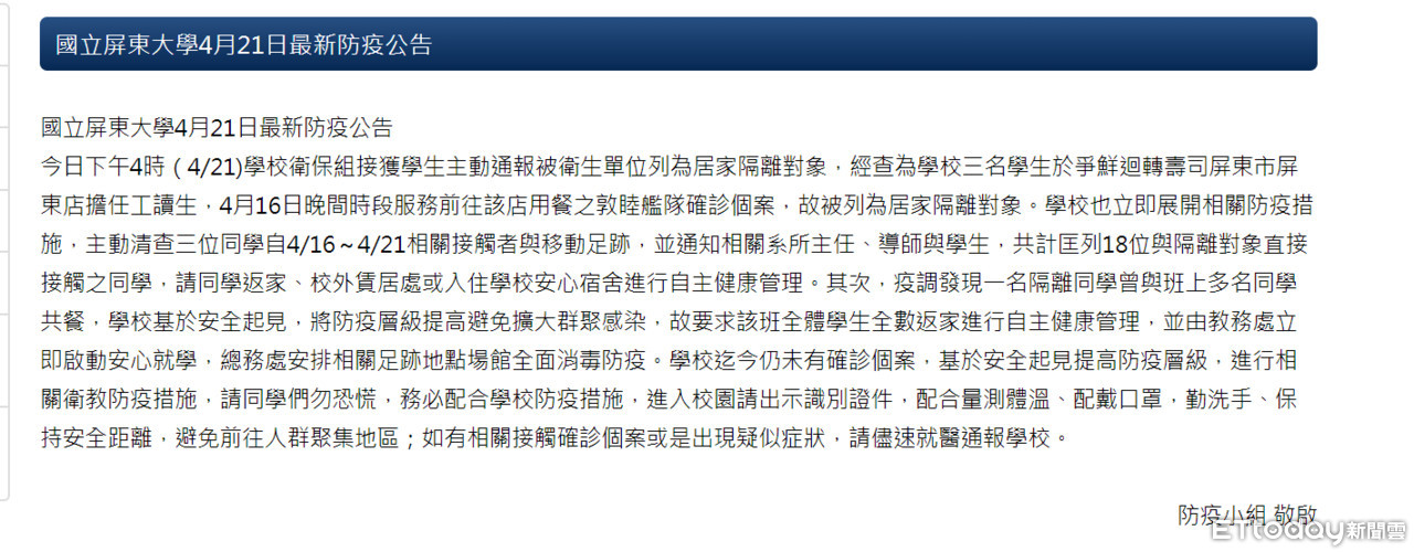 屏東大學表示,昨(21)日下午4時,學校衛保組接獲學生主動通報被衛生單位列為居家隔離對象,經查為學校3名學生於爭鮮迴轉壽司屏東市屏東店擔任工讀生,4月16日晚間時段服務前往該店用餐之敦睦艦隊確診個案,故被列為居家隔離對象。