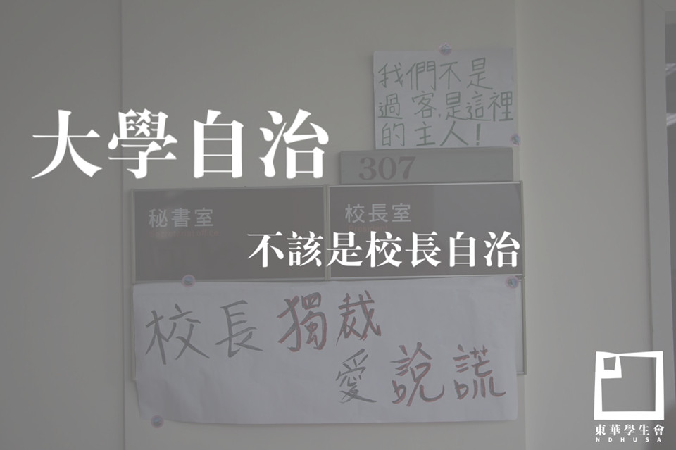 東華大學學生會10日表達三大訴求,希望學校「撤回禁酒令」、「有關學生事務的會議應邀請學生代表出席」、「未來相關議案由所屬委員會討論」,而面對校方遲遲未正視學生聲音,數十名學生22日舉起「校長獨裁愛說謊」、「我們不是過客,是這裡的主人」等大字報,前往校長室陳情。