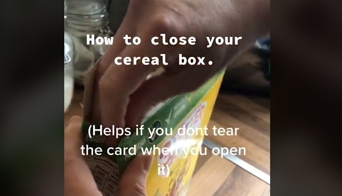 一般人若要將紙盒裝的麥片保存,可能是用橡皮筋或夾子封住開口處,不過英國網友凱蒂·貝(Katy Bee)在抖音平台上傳一段影片,並附文寫下「看來我們都搞錯封住麥片盒的方法了」。