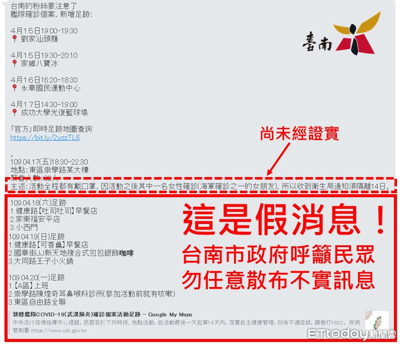 敦睦鑑隊爆發群聚感染新冠病毒事件後,台南市政府Line官方帳號雖立即公告有關確診個案最新足跡,但卻有社群平台陸續出現4月19、20日未經證實及不實足跡訊息,其中南區大同路某店亦遭流言波及,已影響店家名譽,南市警六分局立即揪出在網路上散布假消息者,並將其移送法辦。