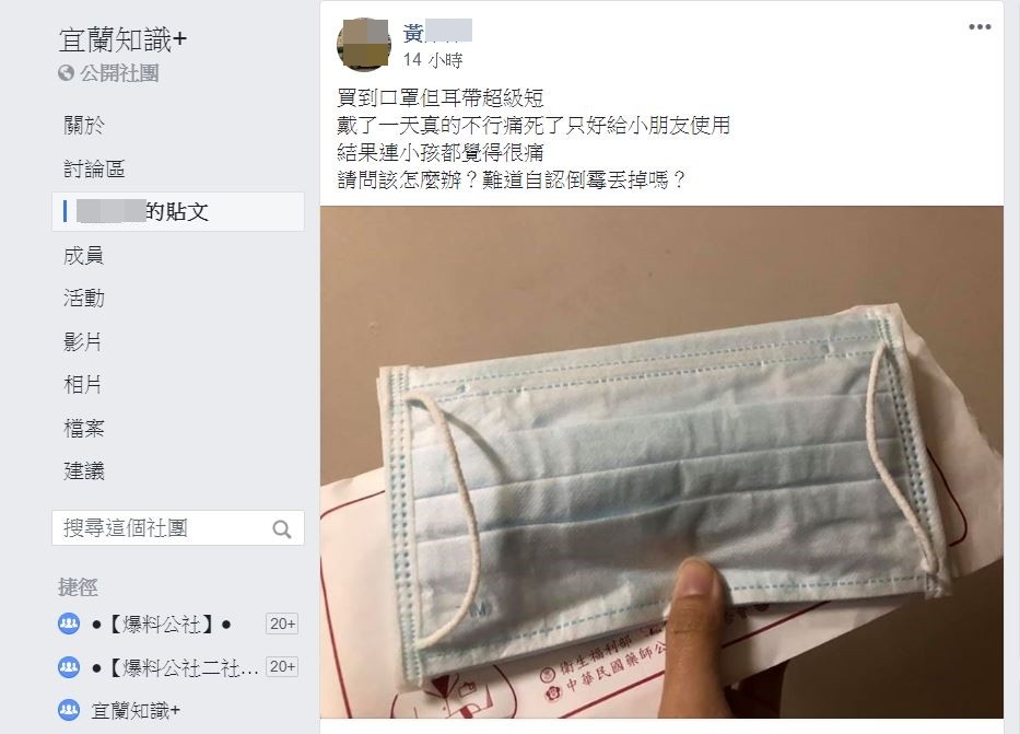 最近網紛紛在《宜蘭知識+》說:「痛到靠北阿~」「真的很短,戴的超痛苦的」、真的很短,戴的超痛苦的…」、「感覺這批都這樣,耳多超痛」、「真的很痛+1帶子真的變很短」、「很痛,非常不舒服」、「最近宜蘭來的口罩線都好短,投訴無門」、「宜蘭全部換到的都是這麼短的吧!我今天換了兩家一樣都是短的,所以我直接上網預購,但要多七塊錢,希望可以拿到驚喜包。」……