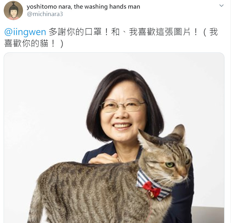 日本知名藝術家奈良美智23日透過推特感謝台灣捐贈日本口罩,還附上總統蔡英文抱著「貓主子」蔡想想(Cookie)的照片,她在24日再度回應蔡英文留言,不但請小英代向Cookie問好,還承諾等疫情後要來台灣舉辦大型展覽。