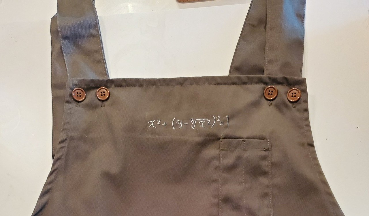 網友shelfall收到妻子的禮物,那是一件深色的樸素圍裙,正面胸口處卻手工繡上一道數學方程式。他在好奇心驅使之下,動手計算,想要解開謎題,卻意外發現每一組解答在座標軸上的位置正好可以畫出一顆大愛心。