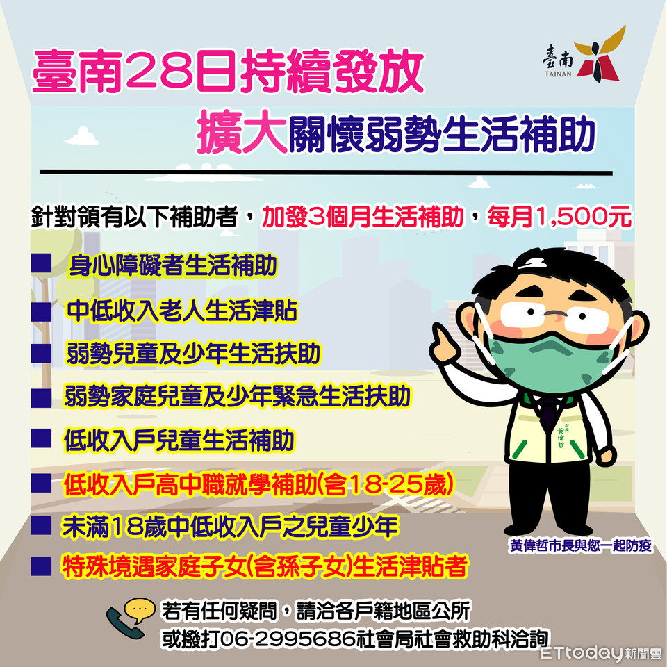 黃偉哲市長呼籲,在新冠肺炎防疫期間,臺南市政府不僅積極防疫超前部署,也會持續陪伴台南市民並提供必要的協助,民眾若對本次「行政院關懷弱勢加發生活補助」有任何疑問,可洽各戶籍地區公所或撥打06-2995686社會局社會救助科洽詢。