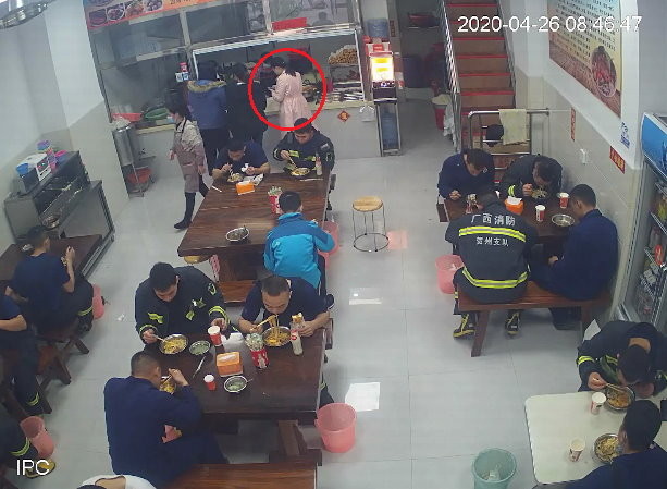 從米粉店老闆提供的監視器畫面看到,在8時34分左右,一位身穿粉色外套的女子帶著一名男孩,與消防員們先後進到米粉店裡用餐。就在15名消防員用餐時,這名女子便起身走到收銀台前,悄悄地為消防員們掃碼支付了早餐費用,與一旁的男孩吃完後,便匆匆離開。
