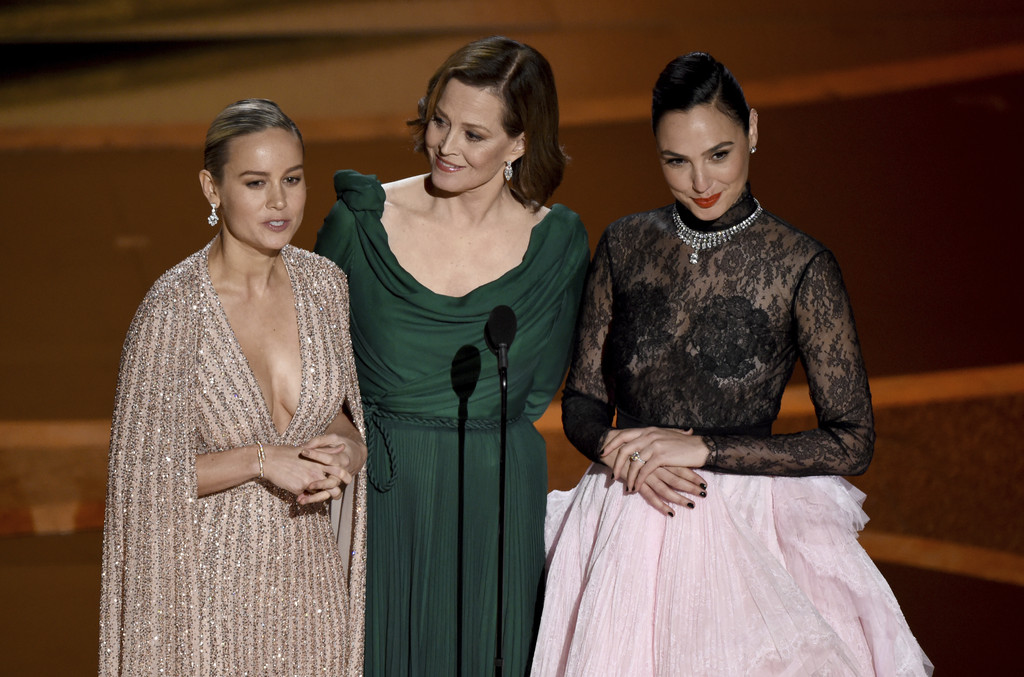 ▲三名女超人:布麗拉森(由左至右)、雪歌妮薇佛、蓋兒加朵今年在奧斯卡頒獎典禮上合體的畫面。(圖/達志影像/美聯社)