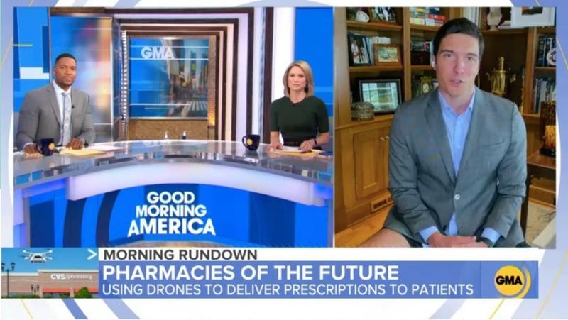 美國ABC電視台的晨間節目《Good Morning America》,請記者威爾李維(Will Reeve)採訪關於佛羅里達州用無人機為老年人遞送處方箋藥物的服務。當在棚內的主持人跟他進行連線時,畫面上的李維上半身是西裝搭配襯衫,坐著進行連線訪問,但是在字幕底下的畫面,觀眾都不難發現,其實他沒有穿長褲。