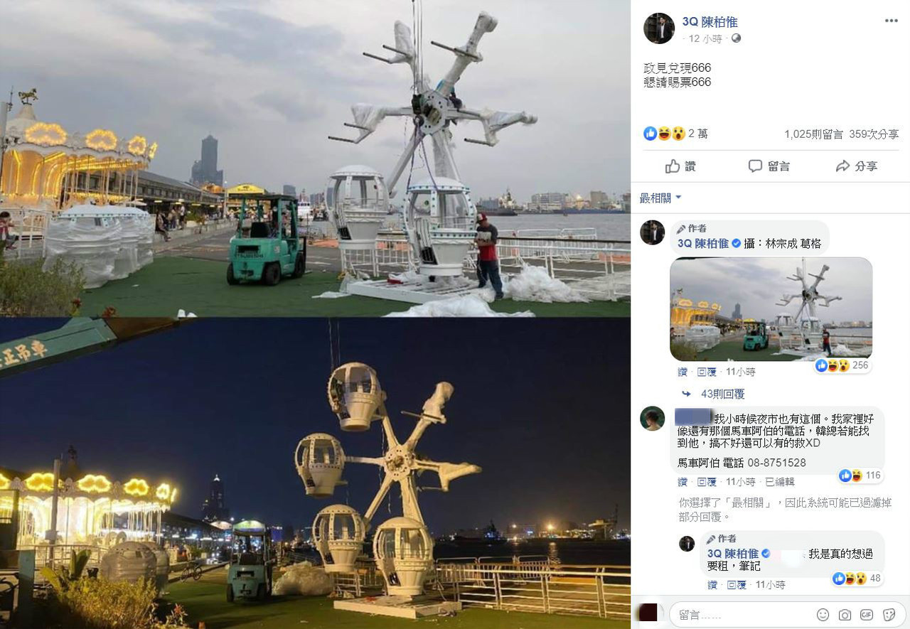 高雄市長韓國瑜選前曾喊出,要建設「愛情摩天輪」,但由於許久未見摩天輪動工的身影,因此引發外界懷疑,但立委陳柏惟日前在臉書貼出一張照片並指出,「政見兌現666、懇請賜票666」,而照片中的赫然就是摩天輪,但也是這座摩天輪引發不少網友熱議。