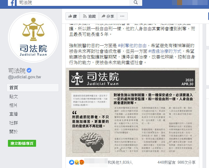 司法院在臉書PO文指出,刑法的重要目的是使犯罪者不再犯錯,或對潛在犯罪人產生警惕,但行為人因精神障礙無法辨識行為時,處罰是無法預防對方未來不再犯錯。