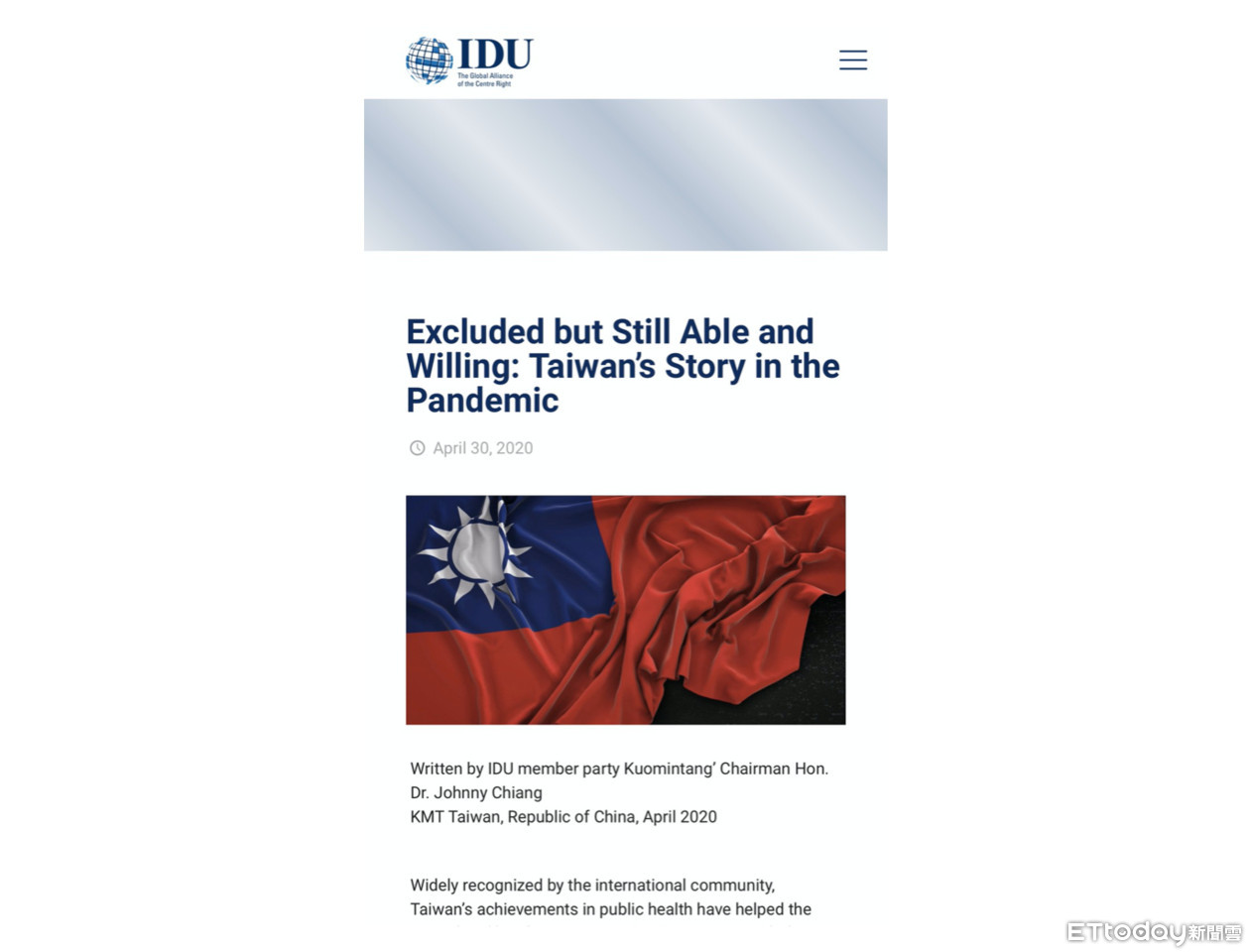 國民黨主席江啟臣在國際民主聯盟(IDU)刊登英文專論,以其4月20日參加IDU線上防疫會議中的發言為基礎,疾呼台灣需要參與世界衛生組織(WHO),而世界衛生組織也需要台灣。