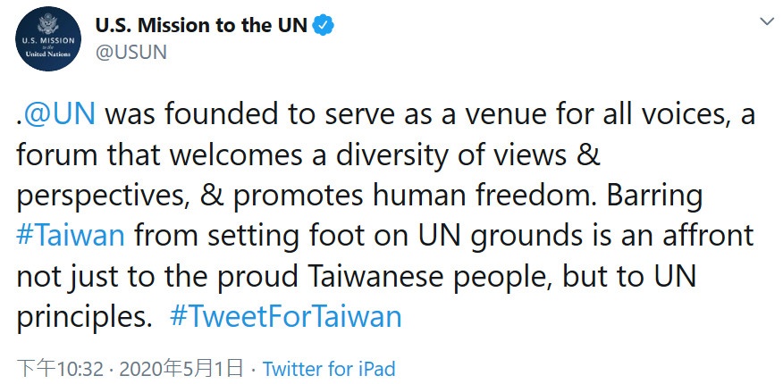 美國國務院「國際組織局」(Bureau of International Organization Affairs, IO),在推特上發起了聲援台灣推文活動「#TweetforTaiwan」,邀請全球網友一起推,聲援台灣加入今年的世界衛生大會(WHA)。