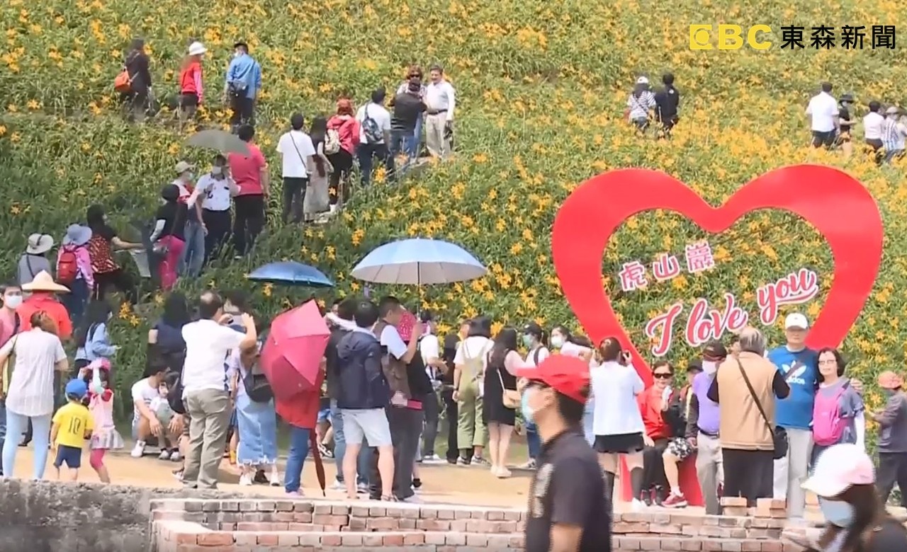 彰化金針花海因為五一連假,湧入了非常多人希望打卡拍照,但也因為人實在太多了,讓小小的樓梯步道幾乎塞住,園方人員見狀趕緊用大聲公喊話,希望遊客保持室外社交距離1公尺,畢竟走完全程差不多要半小時,太過於密集的人潮就怕真的發生意外。