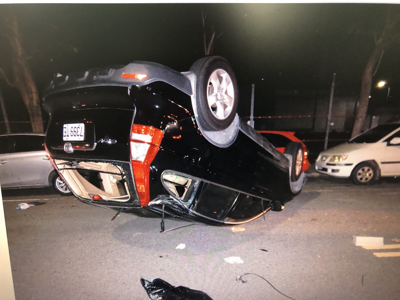 王男的車翻覆後,車內5人狼狽逃出車外,王男沒受傷,20歲楊男右手肘較嚴重送林新醫院就醫,24歲林姓女子沒受傷、26歲郭姓女子右肩及背部擦傷、27歲林姓男子右手輕微擦傷。