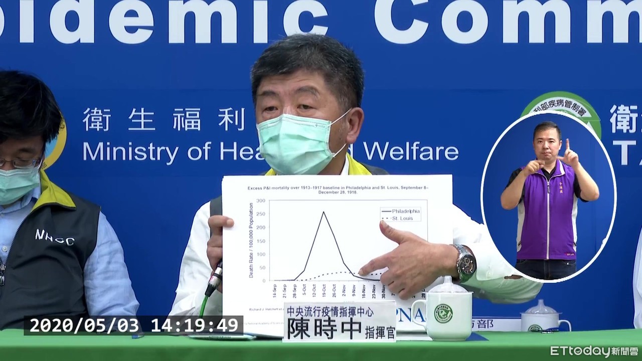 陳時中指出,1918年西班牙流感大爆發時,費城因未及時針對社區採取防治措施,最終導致超過1萬人死亡,而同在美國的另一個城市聖路易斯,在出現首例確診後即採取關閉學校、教堂等一系列管制措施,因此在疫情高峰時,聖路易斯的死亡數遠低於費城,但在疫情開始下降後,因各項管制鬆綁,聖路易斯反而造成另一波的疫情及死亡人數增加。