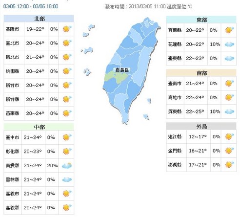 另外,中央氣象局表示,5日白天起大陸冷氣團減弱,氣溫回升,日夜溫差大,台灣各地及澎湖、金門、馬祖大多為晴到多雲的天氣,僅東部及東南部地區有零星短暫雨。6日台灣東半部地區及北部山區有短暫雨,其他地區及澎湖、金門、馬祖仍為多雲到晴的天氣。