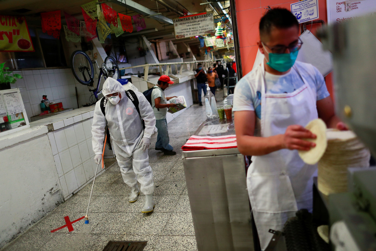 ▲圖為墨西哥市場進行消毒,防範新冠肺炎擴散。(圖/路透)