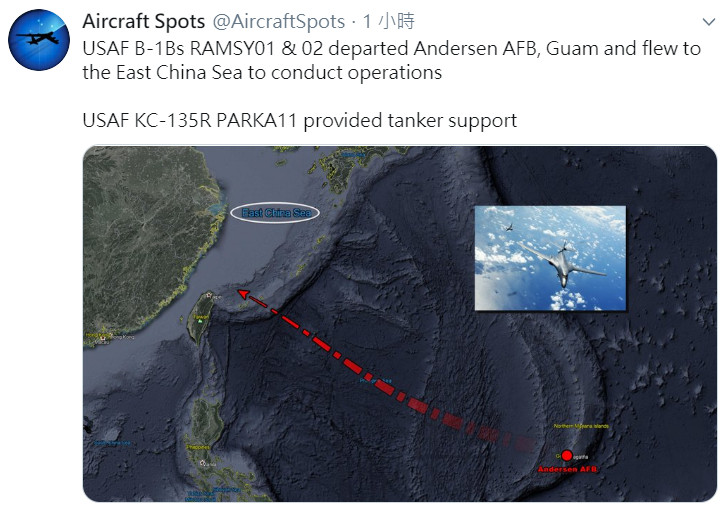 《飛機守望》(Aircraft Spots)6日下午在推特上指出,今天下午美軍派出2架B-1B超音速戰略轟炸機、1架KC-135空中加油機,從關島安德森空軍基地出發,前往大陸東海執行任務,且行經路線掠過台灣東北方海域,而這也是美軍5月第3度飛抵台灣附近空域。
