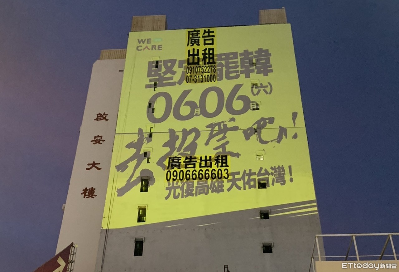 罷韓團體在高雄市街頭連續掛了五面罷韓廣告看板,但全因不合法因此全被拆除,有網友提供創意,建議用外牆投影,因此罷韓團體6日在中山及青年路口,投攝出堅定罷韓等字樣,在夜晚中格外顯眼。