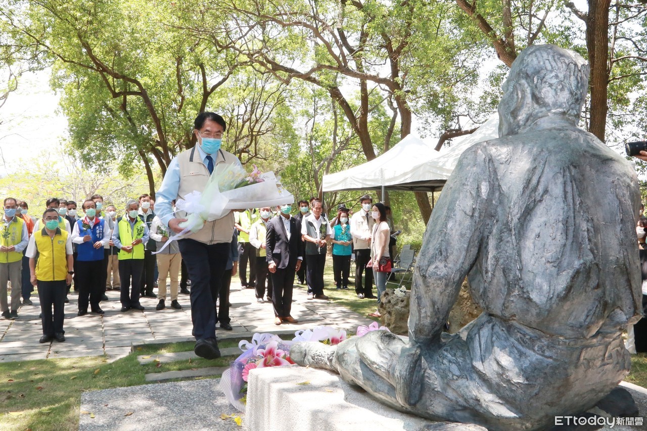 ▲台南市長黃偉哲6日提前來到烏山頭水庫獻花追思八田與一逝世78週年,並為「引水‧程金-烏山頭水庫舊送水口經典老照片展」主持開幕式。(圖/記者林悅翻攝,下同)