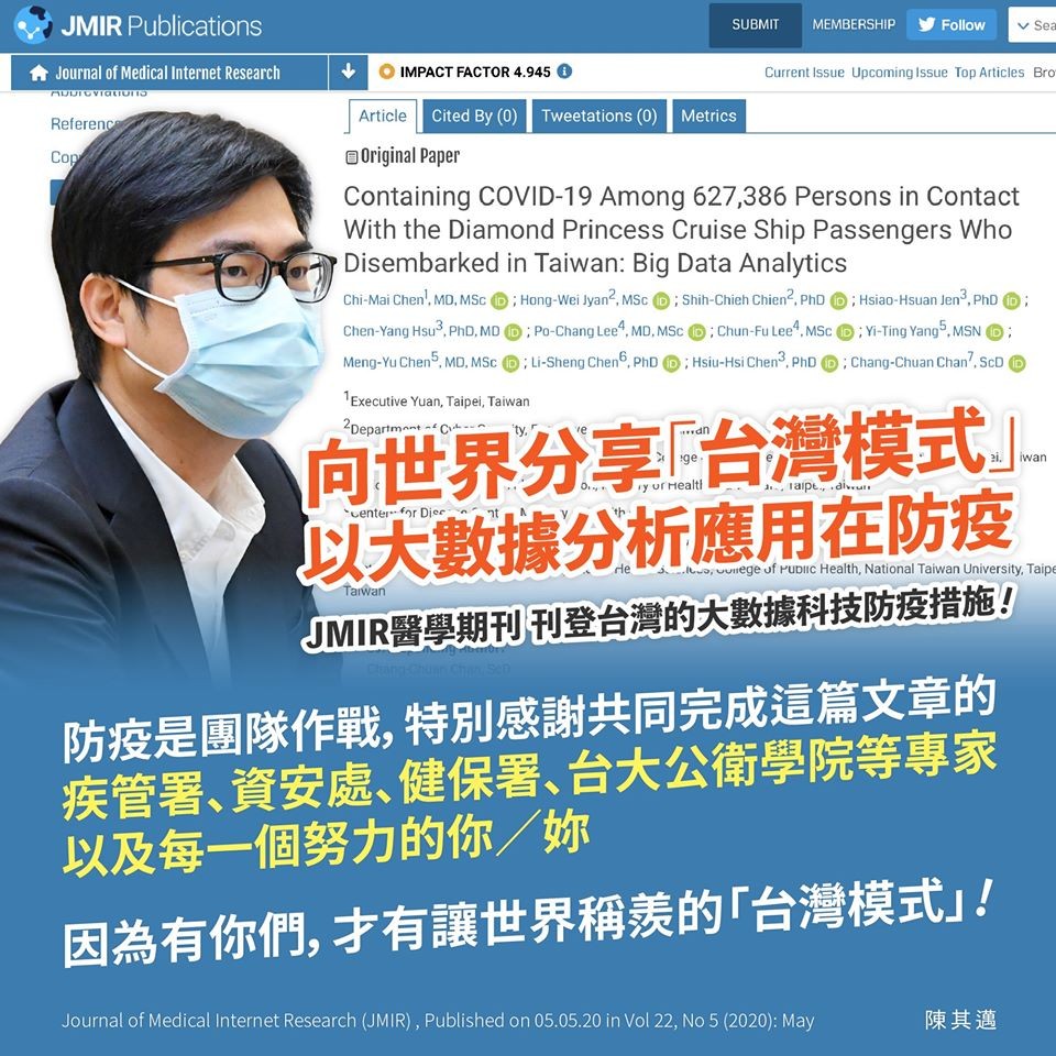 陳其邁感性說道,「這次把台灣模式投稿到國際醫學期刊,今天正式刊出。防疫是團隊作戰,特別感謝一起完成的疾管署、資安處、健保署、台大公衛學院等專家,以及每一個努力防疫的你/妳。」