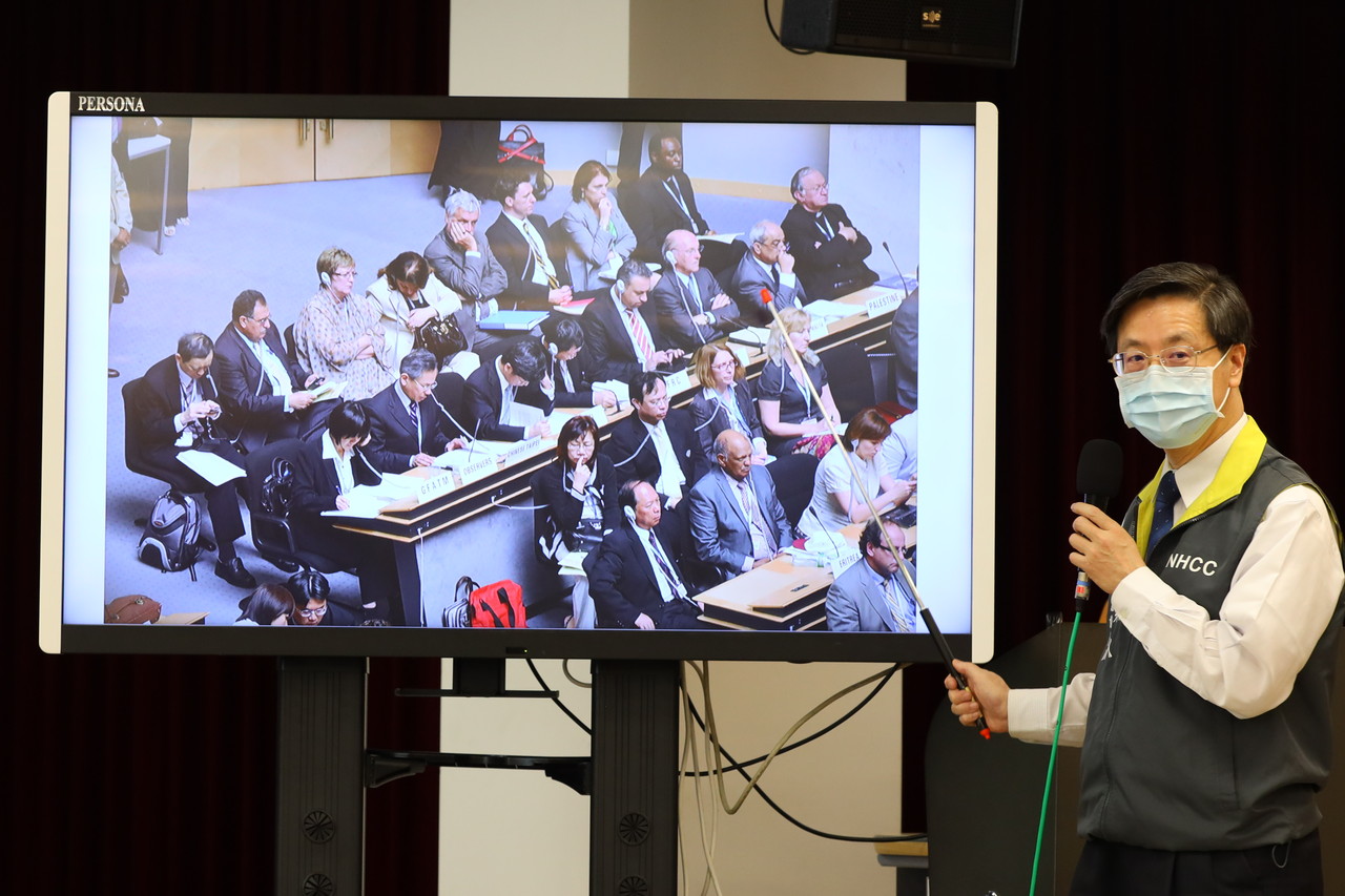 張上淳9日進行國內新冠肺炎病例統計簡報,其中特別分享台灣過去以觀察員身份進入世界衛生大會的照片,包含他自己、醫事司長石崇良、前疾管署長張峰義等人列席,參與分組專家會議。張上淳說,「一方面希望讓大家知道我們相當努力,另也看到,光這張照片就有多少人把手放在臉部、嘴巴」。