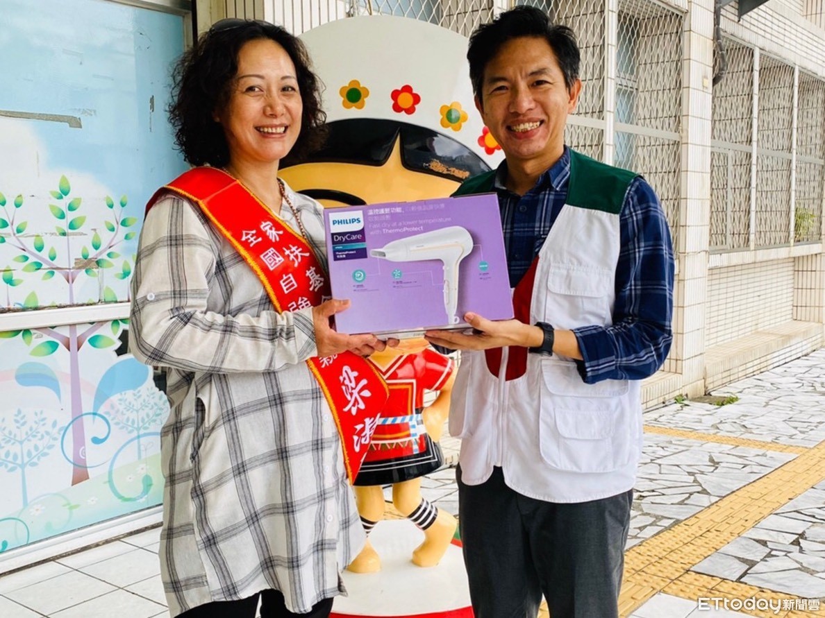 ▲花蓮家扶中心施政延主任代表致贈獎座、肩帶、以及企業贊助的母親節禮物給自強母親梁淑琴媽媽。(圖/家扶基金會提供,下同)