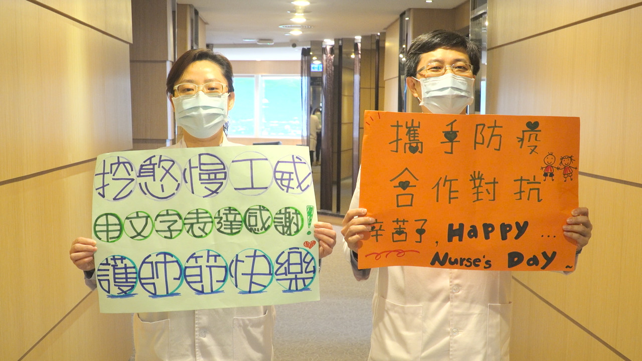 醫院各科別醫師與行政人員等也錄製一支給護理同仁的祝福影片,用跳舞、唱歌和手勢表達發自內心的心意,也凸顯出許多醫師私底下幽默風趣的一面。