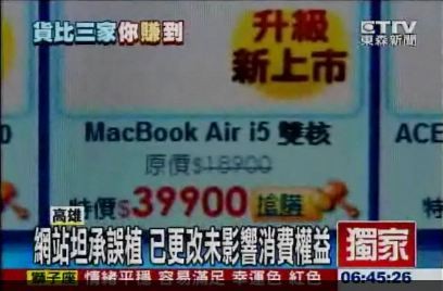 ▲這次標錯價格的分別是液晶電視、雙核筆電與遊樂器的部分,價格最誇張的是MacBook Air i5雙核筆電,原價18,900元,特價卻39,900元。(圖/翻攝自東森新聞)