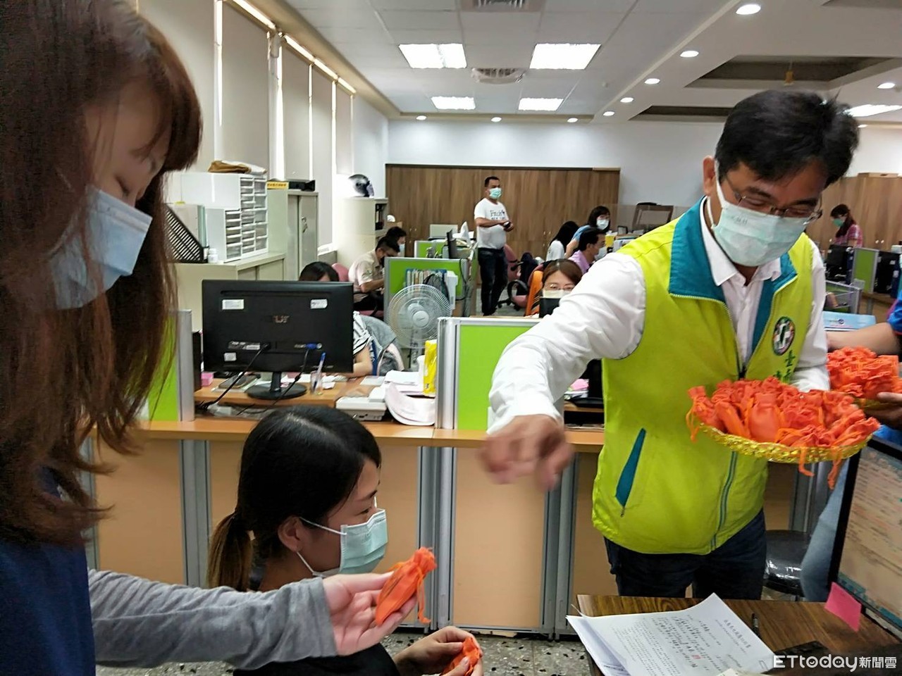 ▲台南市議員陳秋宏、立委郭國文特助陳煥文與福安宮代表,贈送防疫香包給公務防疫人員,官田區長顏能通(右2)代表接受。(圖/記者林悅翻攝,下同)