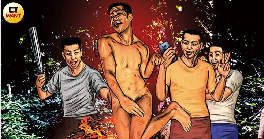 ▲少男小新因與學妹交往並偷嚐禁果,竟遭4、5人押到山上,逼他全裸模仿日本卡通的舞蹈還錄影。(圖/本刊繪圖組)