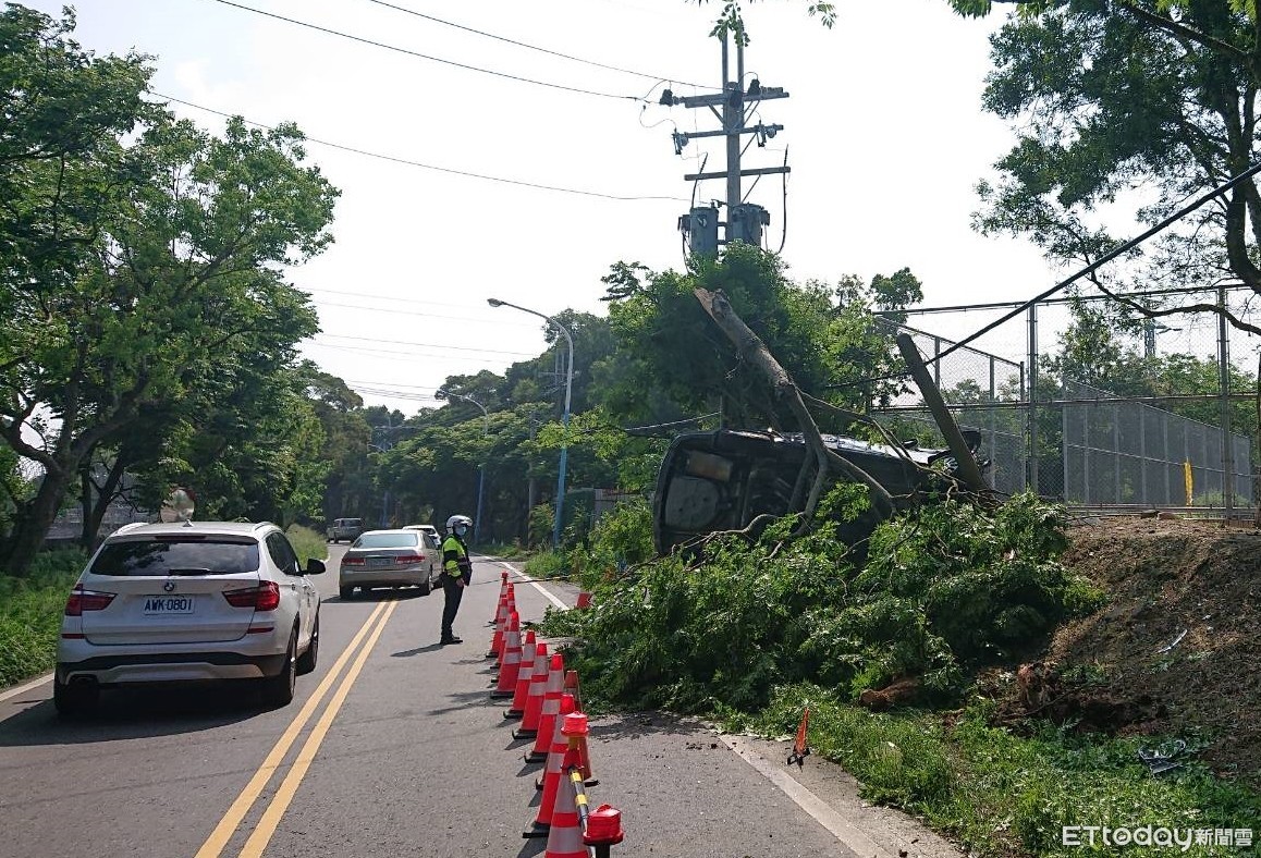 ▲桃園市姚姓男子13日凌晨開車載2名友人在虎頭山區疑似車速過快撞上路樹,警方在現場交管,避免其他車輛誤撞。(圖/記者沈繼昌翻攝)