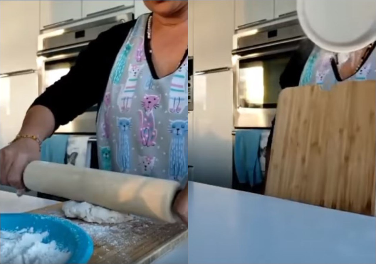智利女網友阿萊里亞(Alegría)6日在臉書上傳,她在家中做麵包、擀麵團的影片,影片中她一邊揉麵團一邊對著鏡頭講解流程,接著她拿出一個棍子要擀麵團,不料因為砧板有部份懸空,加上她剛好在懸空處向下施力,導致砧板瞬間變身成「投石車」,讓裝麵粉的盤子完美的命中臉部。