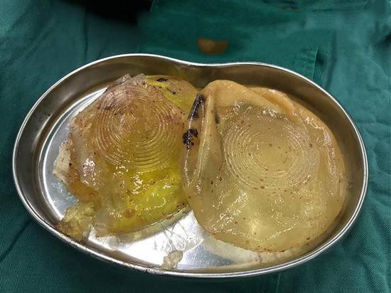 ▲30年前隆乳,取出時已經破裂。(圖/翻攝自紫牛新聞)
