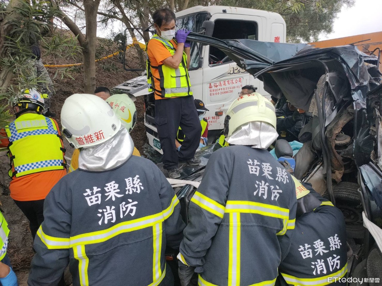 苗栗縣三義鄉苗140線17K處,14日上午9時許驚傳車禍,1輛自用小客車行經此路段時,和2部砂石車發生碰撞,小客車被夾在中間,車頭凹陷變形,目前已知小客車上有2人受困,砂石車駕駛也受傷搶救中,至於詳細車禍原因,警方也正在釐清中。