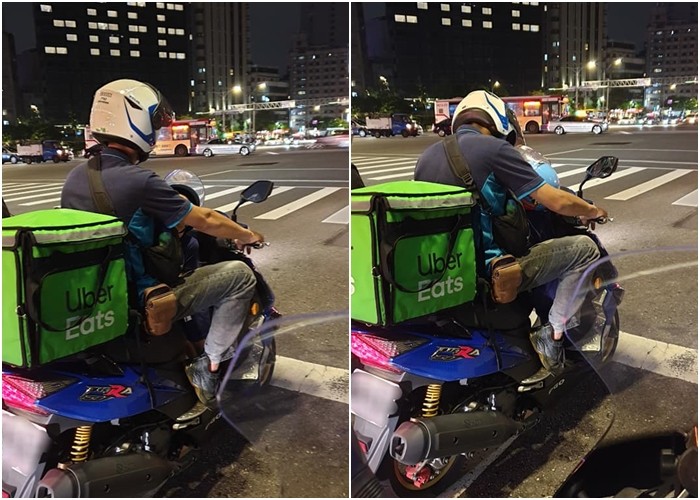劉姓網友貼了3張照片寫道,「等待紅燈的同時,看到了這一幕,突然想起前幾天有人發文說跑外送很丟臉,沒前途。但我卻從這位爸爸身上看到了尊敬跟佩服,從褲管跟鞋子上的水泥污垢,可以猜測這位爸爸白天應該也是在工地做事,晚上小孩沒人顧,所以只能帶著跑外送,停等紅燈的時候,跟小朋友玩鬧一下,小朋友也是開開心心地抱著爸爸。」