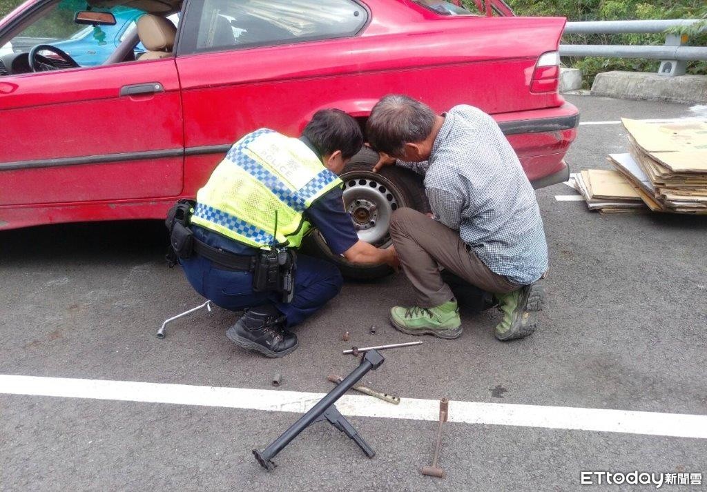 ▲屏東縣枋寮警分局草埔交通小隊小隊長楊文榮、警員洪慈英提供工具協助菜農更換備胎 。(圖/記者陳崑福翻攝,以下同)
