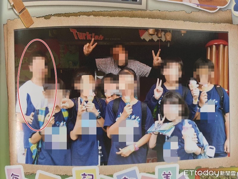 ▲猥褻男童的狼叔(紅圈處)與學童合影的照片竟然收錄在畢業紀念冊中。(圖/記者林悅翻攝)