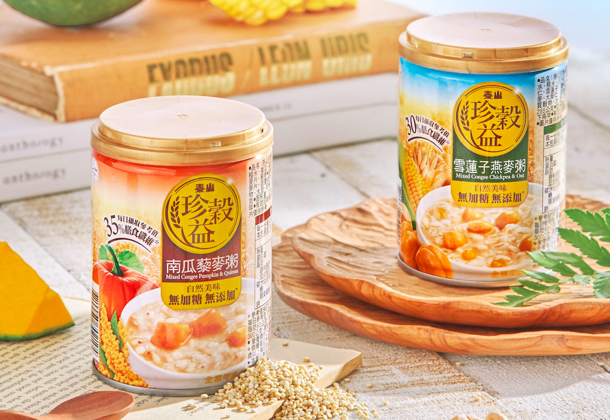 泰山企業率先觀察到現代人日常飲食重視健康,以及對食品安全意識提升的趨勢,本月推出新品《泰山珍穀益》,為市面上第一款「無加糖」的罐裝粥品,且無添加香料、色素等食品添加物,讓消費者吃得安心,少點負擔。《泰山珍穀益》含每日所需30%膳食纖維,可增加飽足感、促進腸道蠕動,維持身體健康。以高溫殺菌真空罐裝,隨手打開便可吃得到多種穀物的自然美味,開創罐裝粥品市場的全新路線。