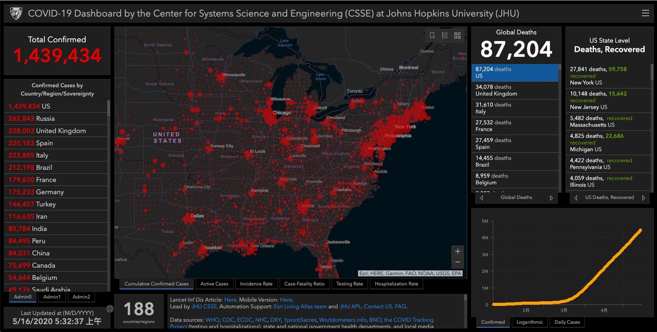 新冠肺炎疫情持續延燒,截至台灣時間5月16日日上午6點為止,全球已經超過452萬人確診、超過30萬人死亡,美國由於疫情仍持續升溫,紐約州長古莫(Andrew Cuomo)宣布防疫封鎖措施延長至5月28日。