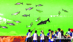▲6日前往河川生態園大熊貓展館參觀的小朋友,有幸看到湄公河巨鯰(前方最大的魚)入住河川生態園的情景。(圖/《聯合早報》)