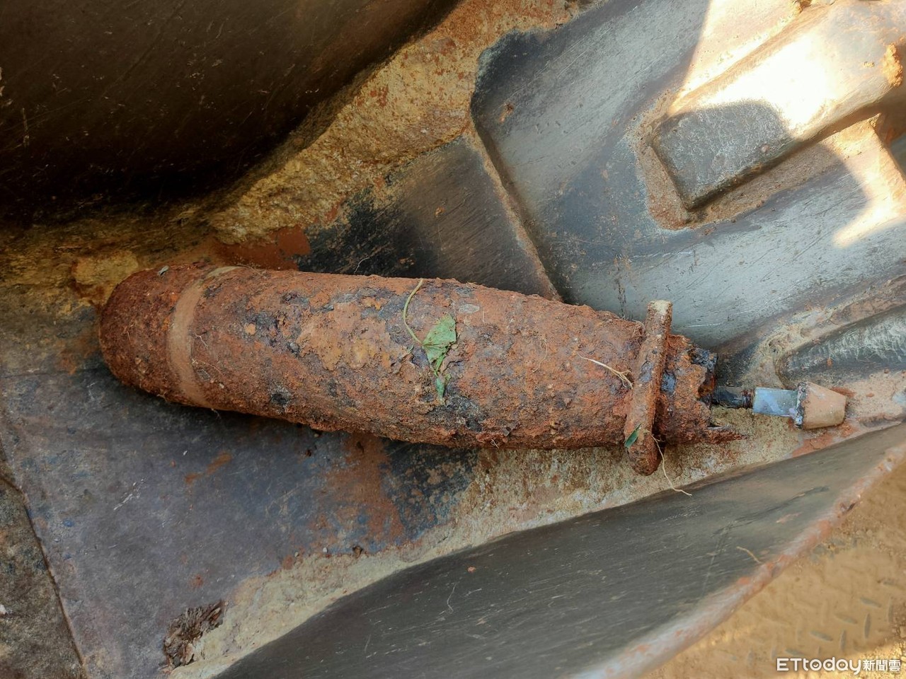 ▲林姓駕駛將未爆彈放在挖土機挖斗。(圖/記者林名揚翻攝)