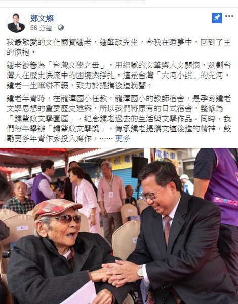 ▲「台灣文學之母」鍾肇政辭世,鄭文燦臉書道感恩。(圖/翻攝自網路)