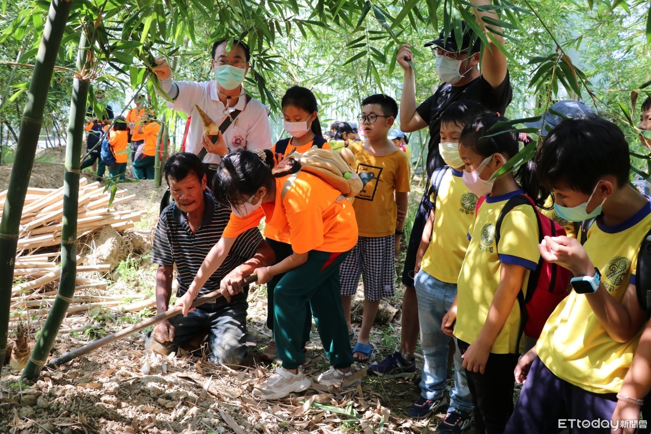 ▲南大附小與台南市七股區大文國小進行校際共學,兩校學童25人體驗採筍及參觀鮮筍處理,並認識竹編與竹炭的應用。(圖/記者林悅攝,下同)