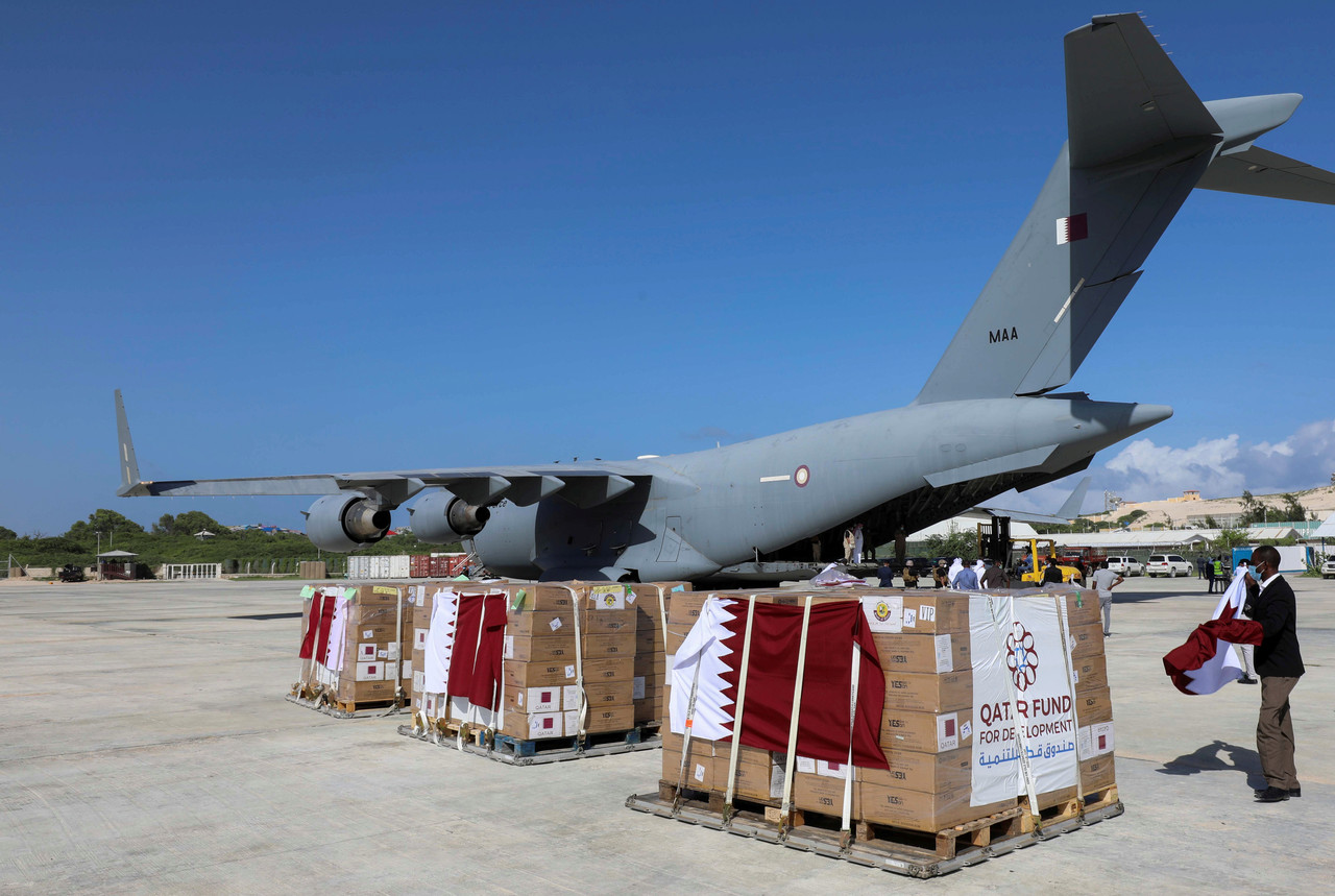 ▲一架卡達軍機在索馬利亞首都摩加迪休(Mogadishu)降落,卸載醫療物資。(圖/路透)