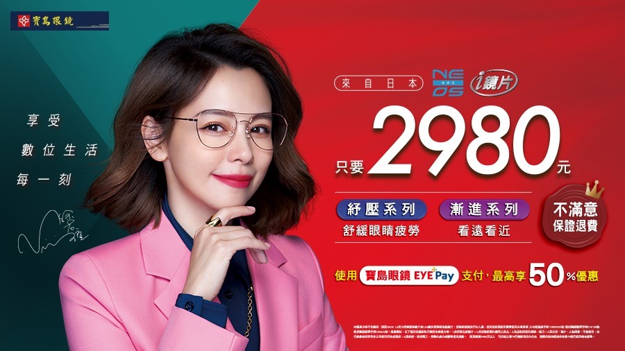 即日起,寶島眼鏡日本NEOS i鏡片舒壓/漸進系列只要2,980元,不滿意保證退費。更好康的是,5月底前使用寶島眼鏡全新推出EYE+PAY支付,最高享50%回饋,不限消費金額還可抽飛利浦掃地機器人!【謹慎理財 信用至上】