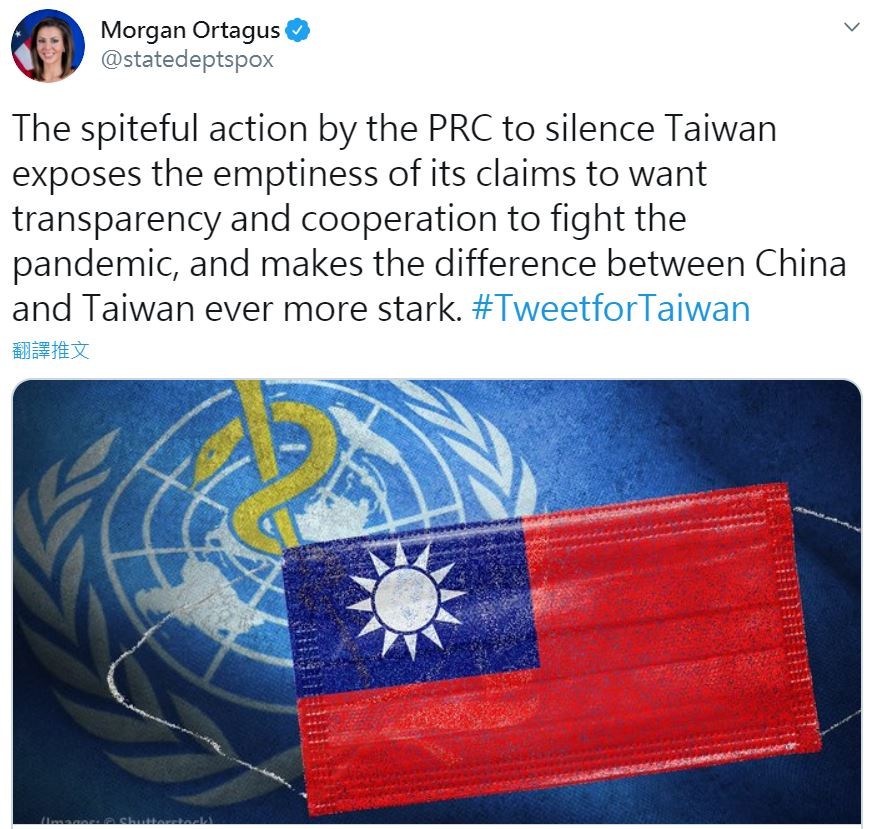 美國國務院發言人歐塔加斯(Morgan Ortagus)18日在推特轉發公文,圖片除了出現世界衛生組織(WHO)會徽,還可見以中華民國國旗為樣式的口罩。她批評中國壓制台灣的「惡意行動」,還不忘標籤「為台灣推文」(#TweetforTaiwan)。